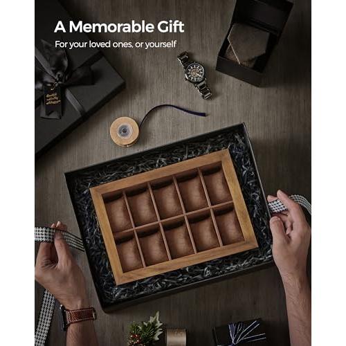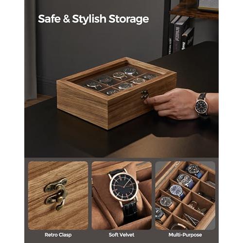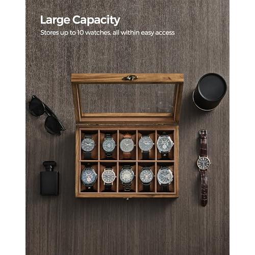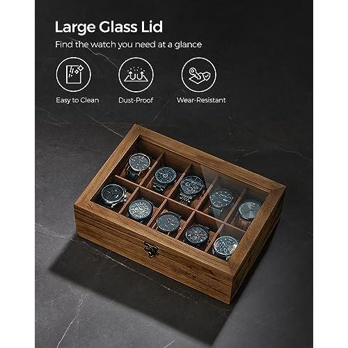 Caja para Relojes con Compartimentos de Madera Maciza con Tapa de Cristal, 10 Ranuras (20,5 x 29 x 8,5 cm) / Nogal Rústico