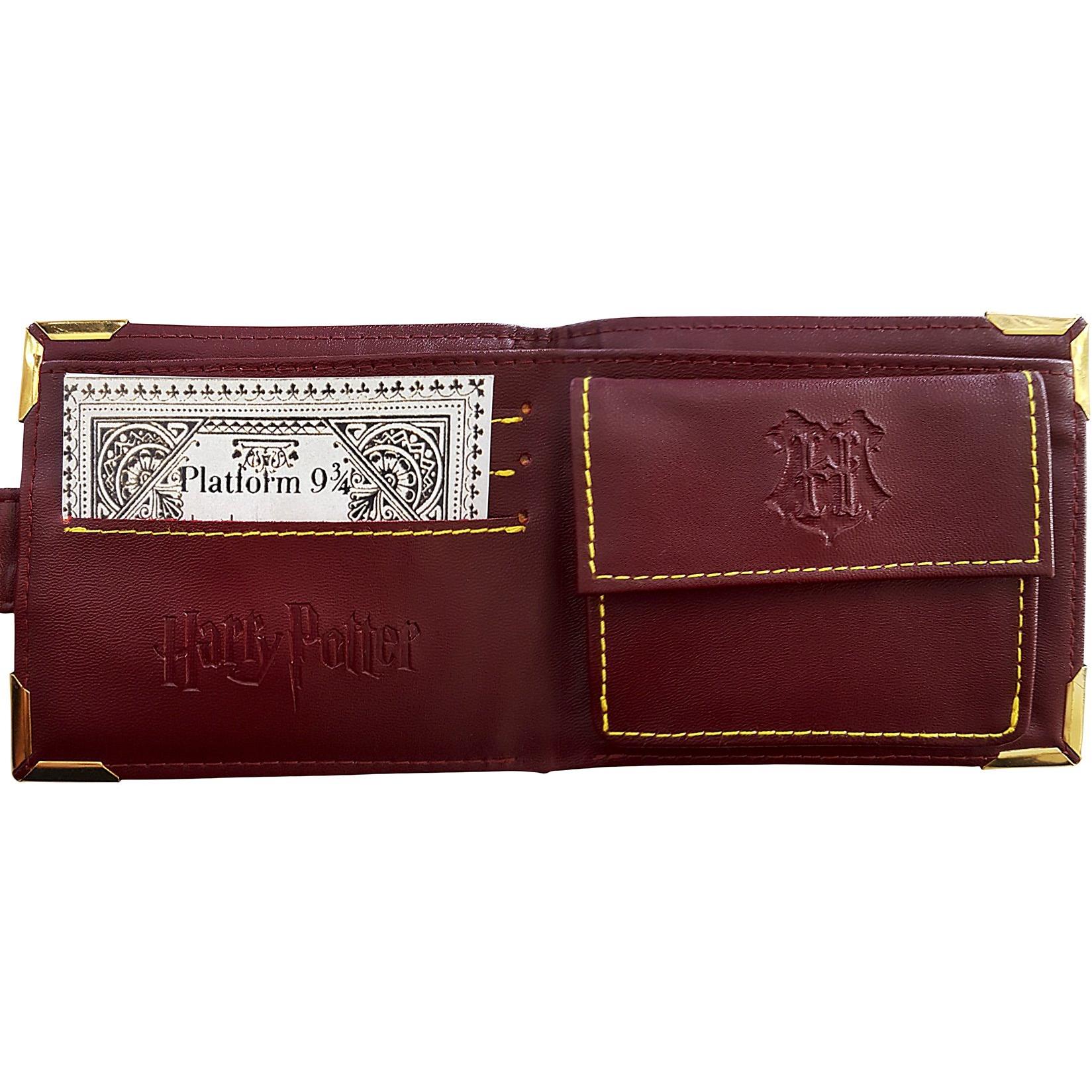 Cartera premium Harry Potter, decorada con el escudo multicolor de Hogwarts y bordes dorados que evocan la elegancia del castillo; doble compartimen ...