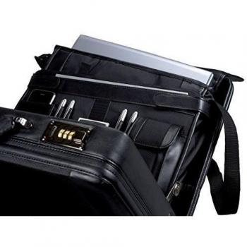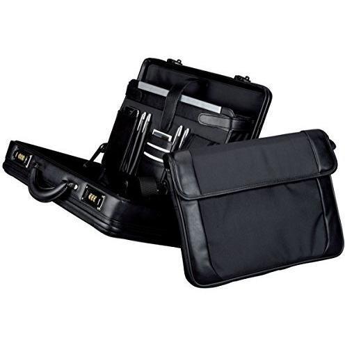 Maletín de cuero negro con funda desmontable para portátil, pensado para viajeros que necesitan protección y organización. Su interior flexible in ...