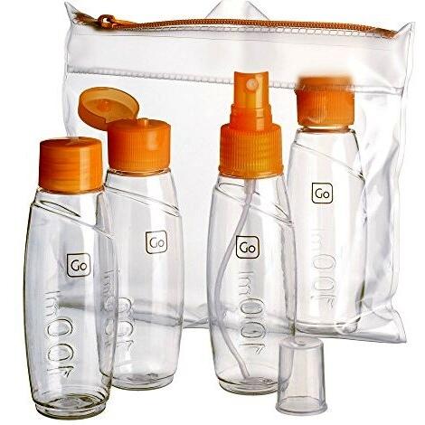 Juego de cuatro botellas transparentes de 100 ml con cierre hermético, aprobadas para cabina; su elegante color naranja y diseño compacto evitan d ...