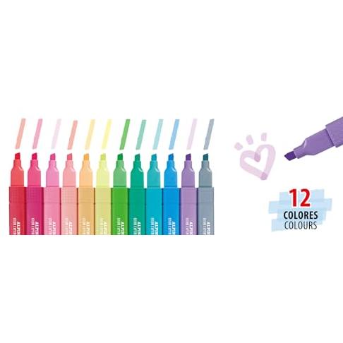 Alpino - Subrayadores Pastel Set de 12 Colores Suaves | Punta Biselada de 1-4 mm | Tinta a Base de Agua | Colores Brillantes | Creatividad