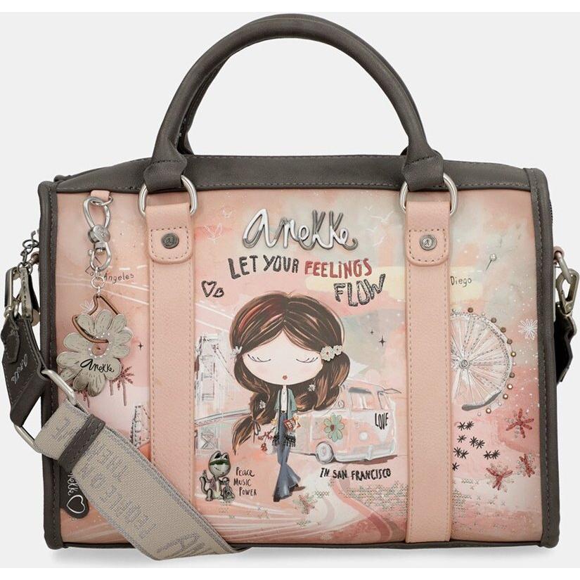 Bolso estilo bowling en color rosa y gris - Anekke Peace & Love - Dos asas de mano y asa bandolera extraíble - Cierre de cremallera - Bolsillo exterior - Mide 30 x 21 x 15 cm