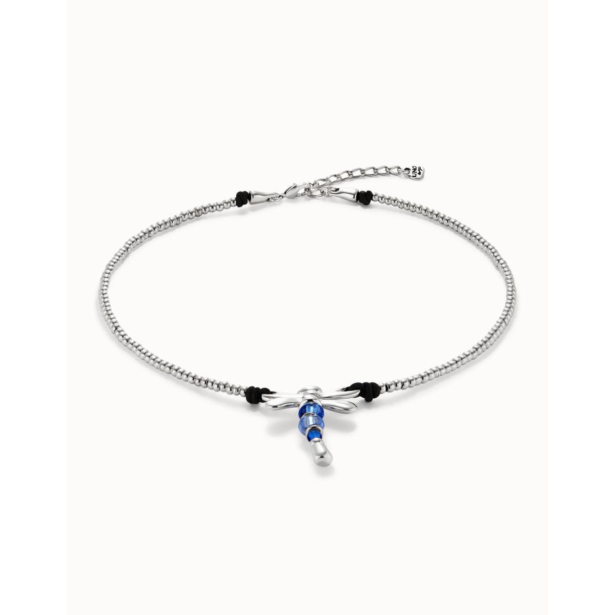 UNO de 50 - Collar corto bañado plata de ley con libélula y cristales artesanales azules.