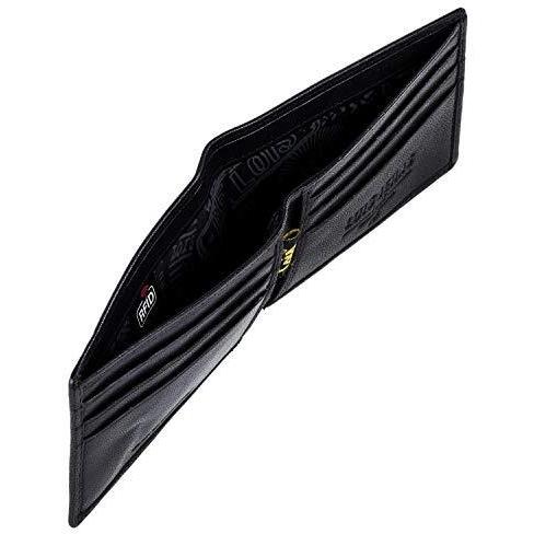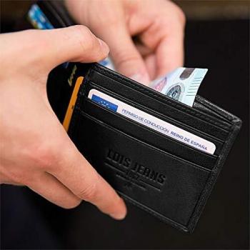 Cartera masculina de cuero genuino negro, delgada y elegante, que guarda tarjetas y billetes en compartimentos organizados; su bloqueo RFID protege da ...