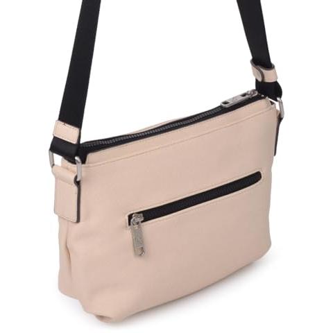 Bandolera pequeña para mujer en beige, confeccionada con materiales veganos de alta resistencia. Ofrece compartimentos organizados, acabado ligero y ...