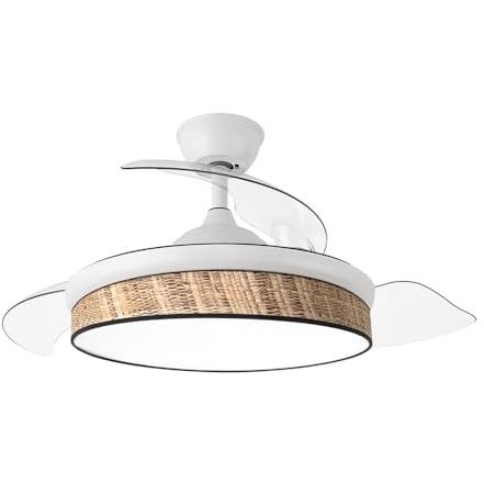 Abrila - Ventilador DC MODA | Color Blanco con tres Aspas Desplegables ABS y Difusor Cañizo Oscuro | 6 Velocidades Ajustables | 3 Temperaturas de Luz | con Temporizador y Mando a Distancia Incluido