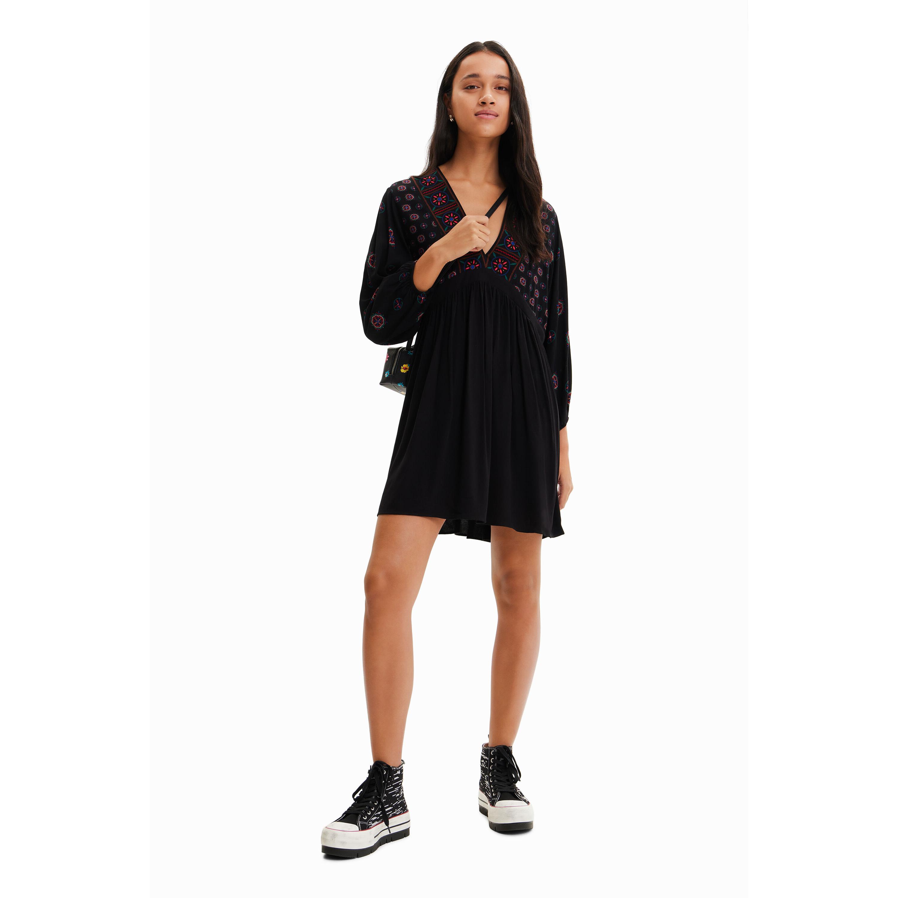 Desigual, Vestido corto estampado étnico, Viscosa, Negro, S