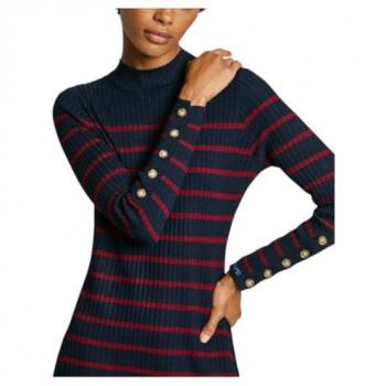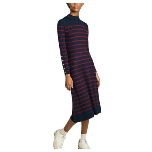 Vestido midi de punto azul con estampado de rayas horizontales y detalle de botones en el cuello alto; tejido ligero que se ajusta suavemente al cuerp ...