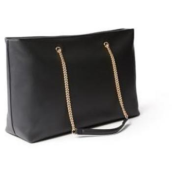 Bolso tote negro con cadena, diseño minimalista y monograma sutil; amplio interior con compartimento acolchado para portátil y bolsillos exteriores ...