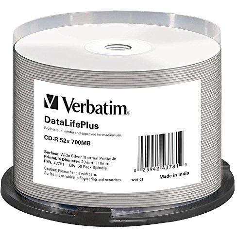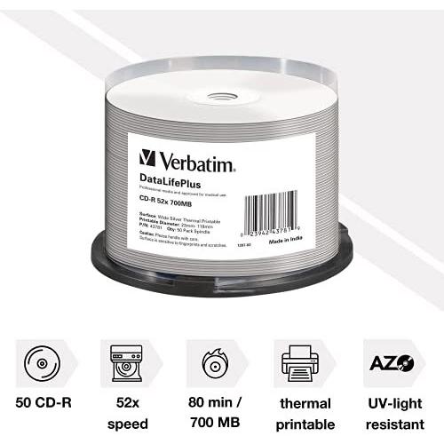 CD‑R Verbatim DataLifePlus da 700 MB in confezione da 50 con supporto a spindel, velocità di scrittura 52× e superficie termicamente stampabile. ...