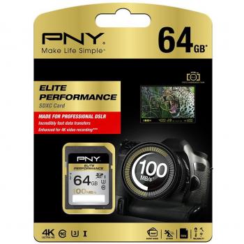 Scheda SDXC PNY Elite Performance da 64 GB, finitura nera elegante, con lettura a 100 MB/s e scrittura garantita per video in alta definizione; co ...