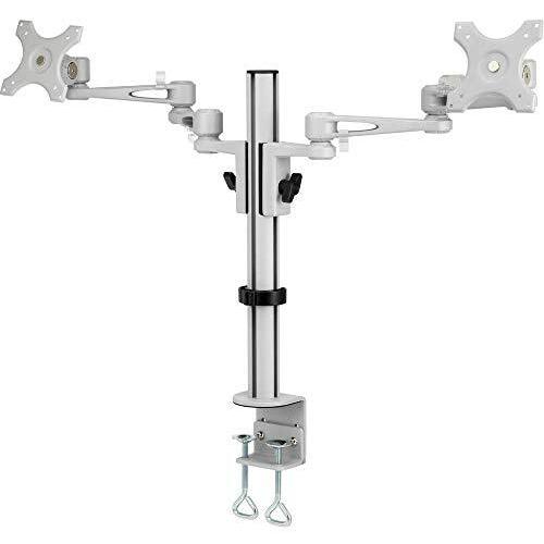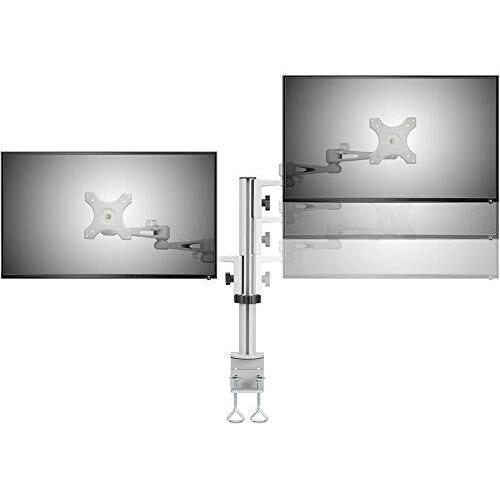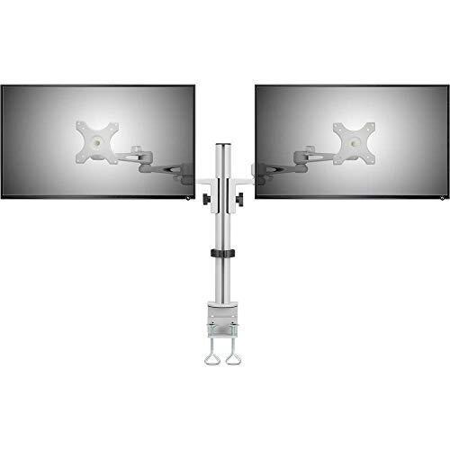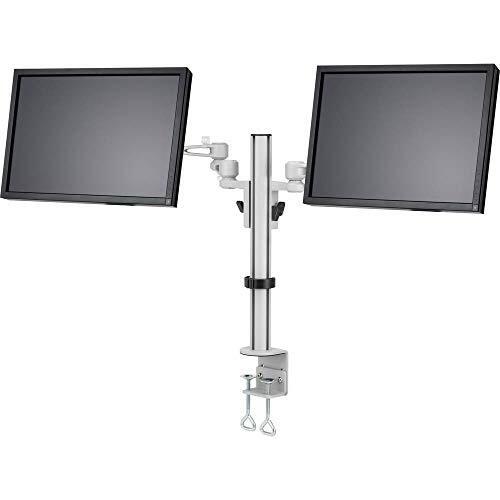 Supporto da tavolo in grigio con morsetto a C per due monitor, altezza regolabile tra 33 e 68 cm, inclinazione e rotazione fluide; bracci robusti of ...