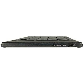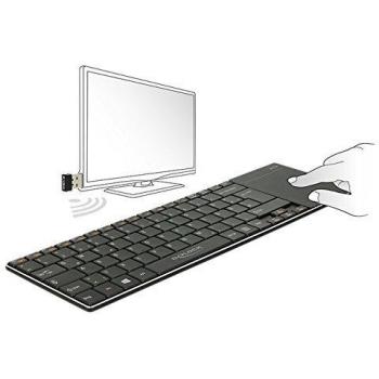 Tastiera nera con touchpad fine da 6 mm, costruita in alluminio leggero e dotata di layout tedesco; si collega tramite micro‑USB, funziona su Wind ...