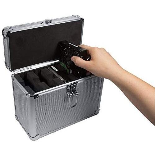 Cassa in ABS argentato con cerniera a chiusura sicura, progettata per trasportare fino a cinque hard disk da 3,5 pollici; dispone di tre porte USB†...