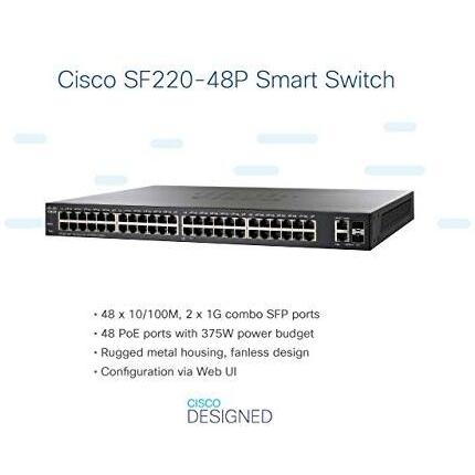 Smart Switch Cisco SF220-48P con 48 porte Fast Ethernet 10/100 più 2 porte Gigabit Ethernet (GbE), PoE di 375 W, protezione limitata a vita (SF220-48P-K9-EU)
