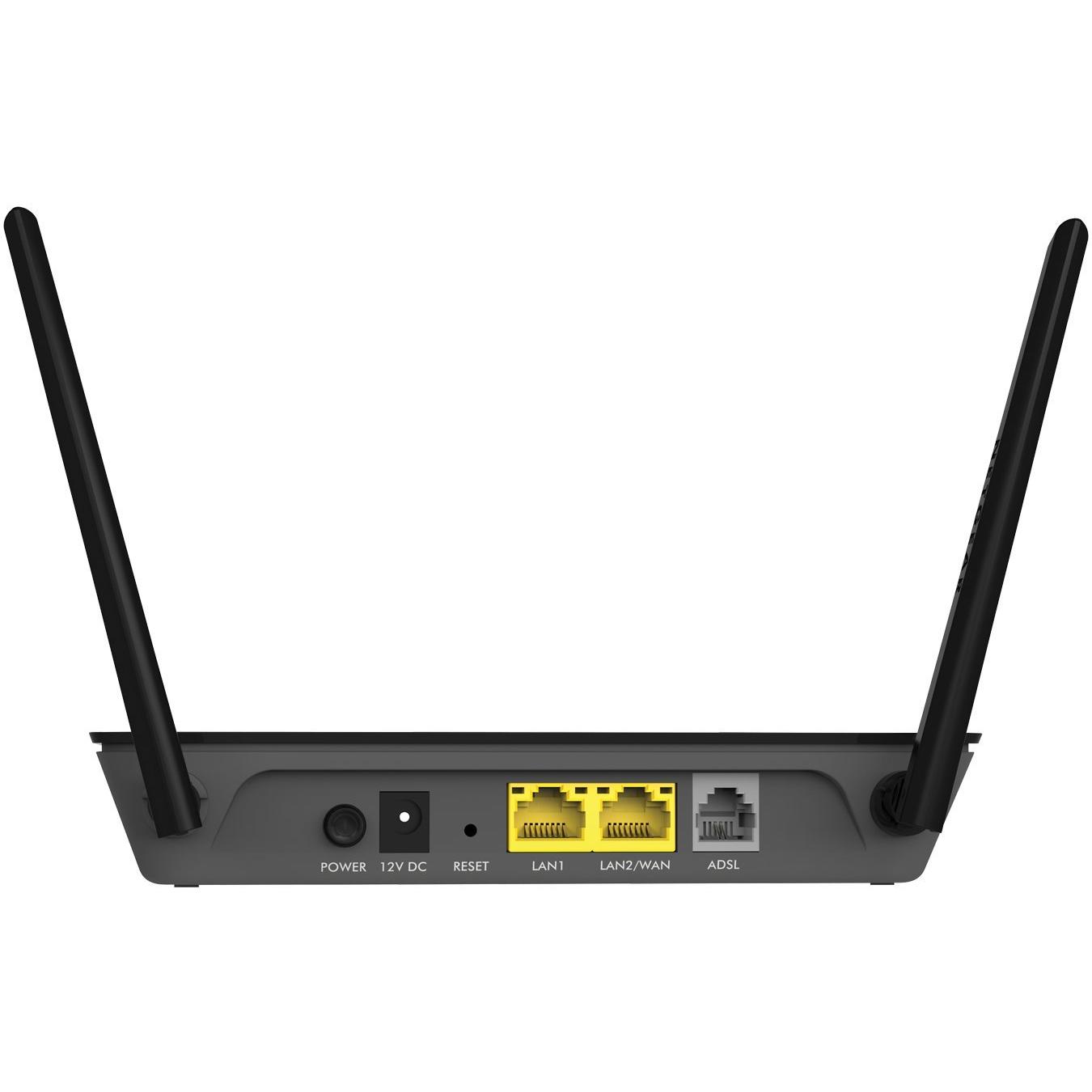 Il modem‑router Netgear D1500 integra ADSL2+ con Wi‑Fi N300 a 2,4 GHz, offrendo fino a 300 Mbps. Con due porte Ethernet Fast e due antenne est ...