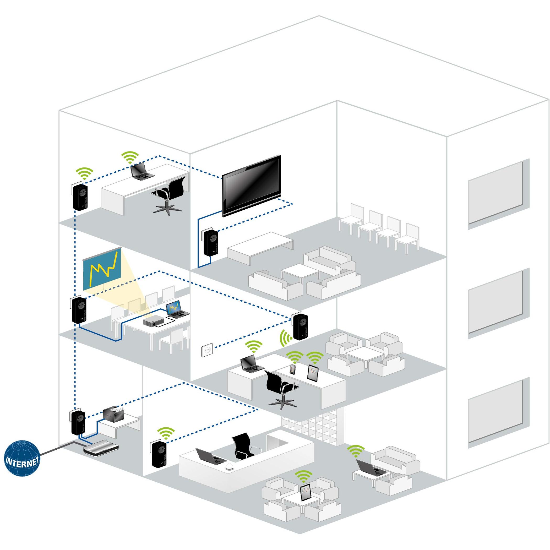 Il Devolo dLAN pro 1200+ WiFi ac Powerline combina una rete cablata stabile con un access point wireless potente: quattro antenne interne, MIMO 2T2R e ...