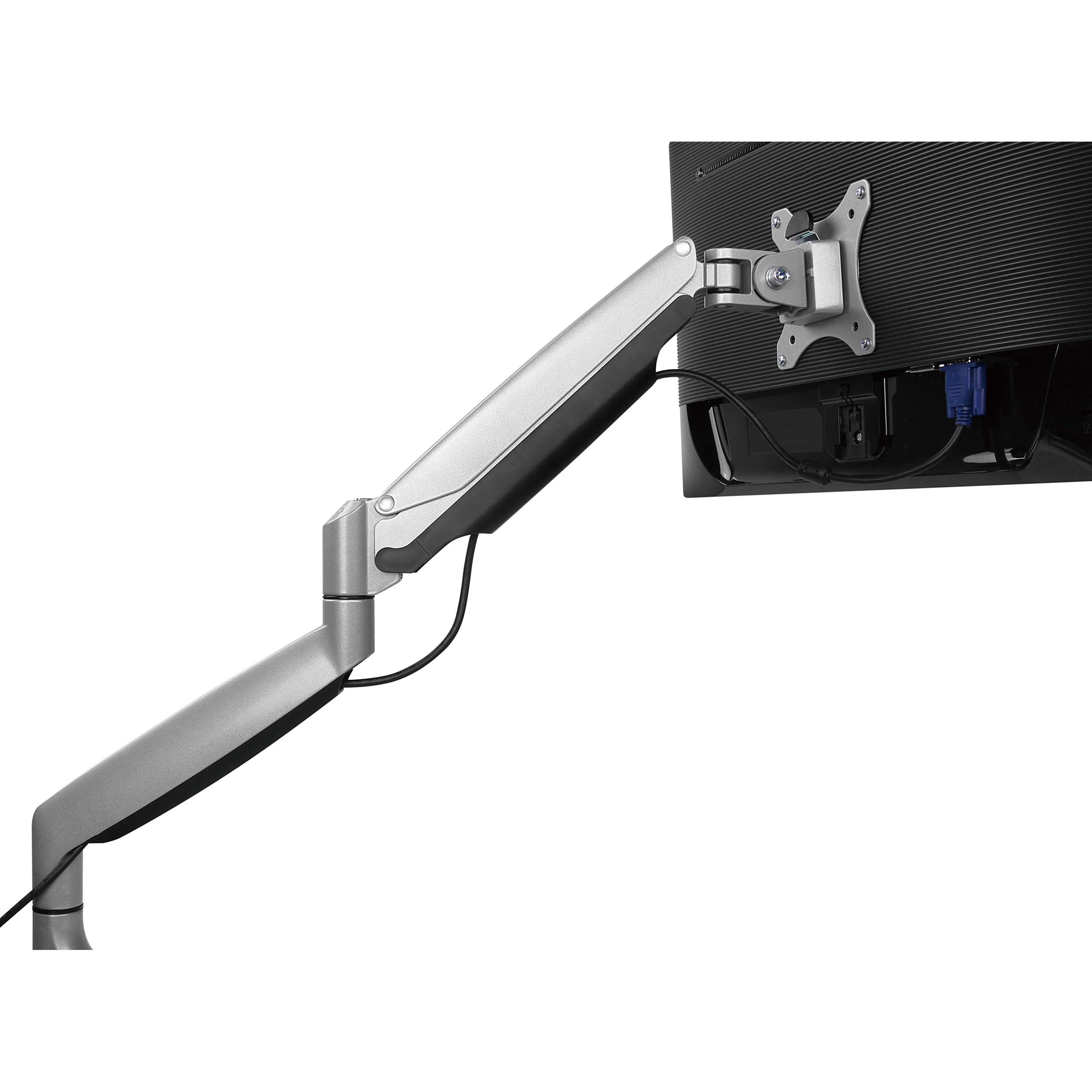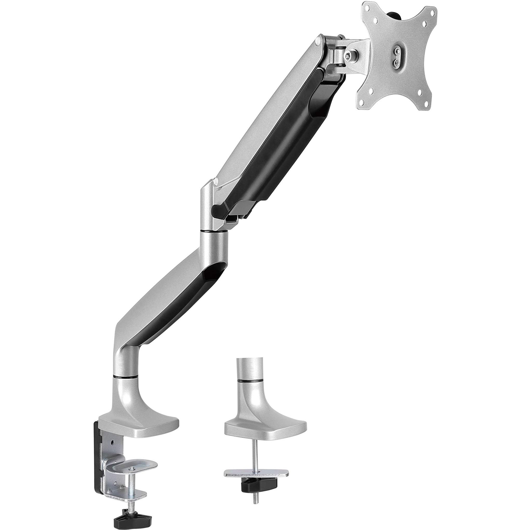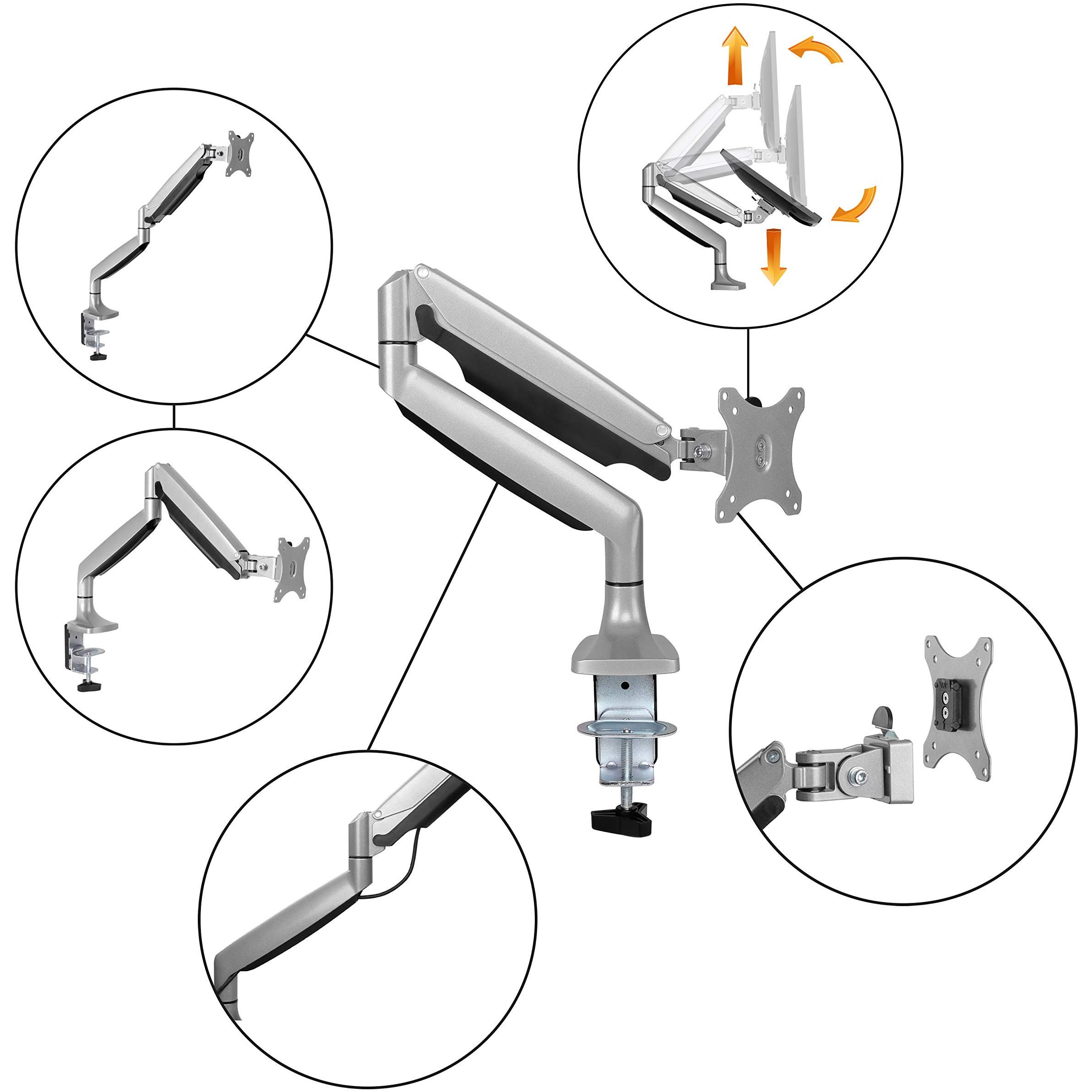 Braccio telescopico con molla a gas che consente inclinazione, rotazione e altezza regolabile in un unico gesto fluido. Supporta schermi da 13” a 30 ...