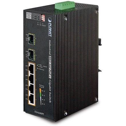 Switch Planet IGS‑624HPT dispone di quattro porte Gigabit RJ‑45 con PoE+ e due slot SFP 1000Base‑X, ideale per reti industriali; dimensioni comp ...