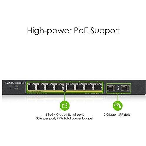 Zyxel Switch Smart Managed PoE+ 8 Porte Gigabit con 77 Watt Budget - design senza ventole e 2 Porte SFP, Garanzia a Vita [GS1900-10HP]