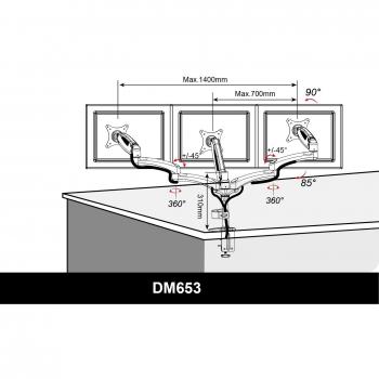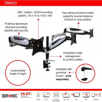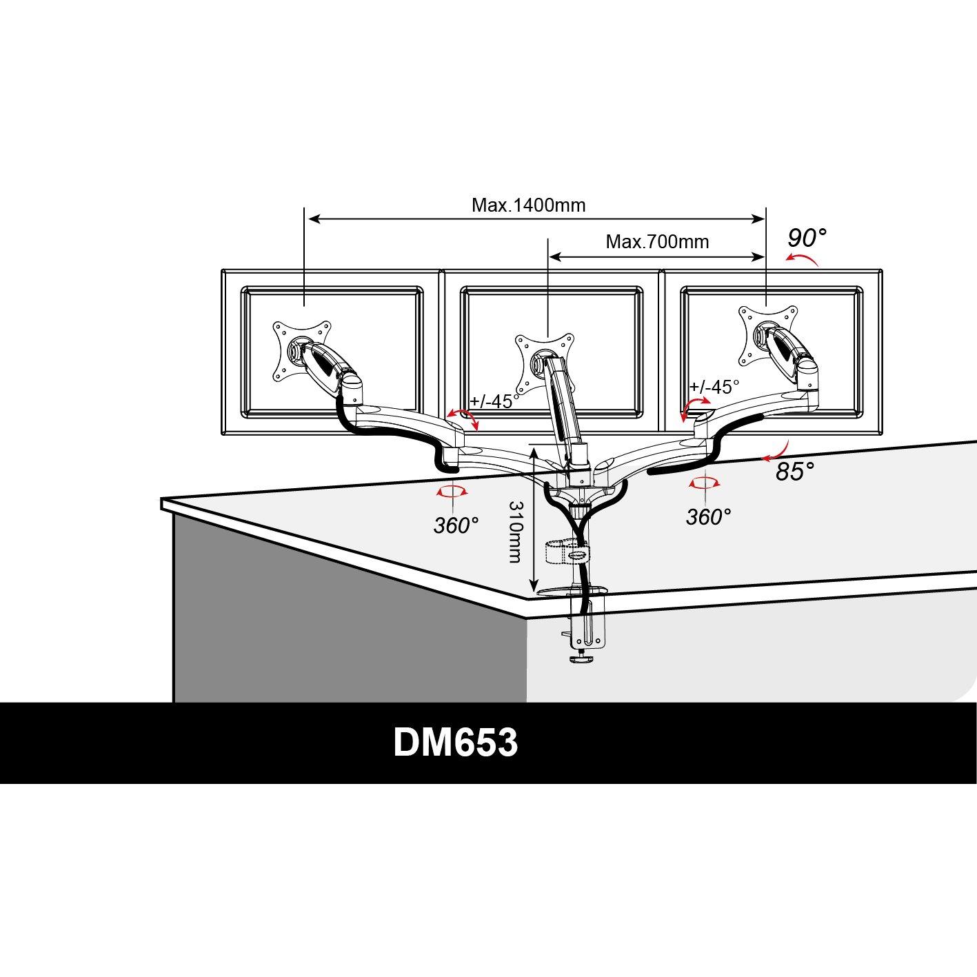 Duronic - Dm653 Supporto Monitor - Supporto Per 3 Monitor Fino A 27" - Portata 5 Kg Per Braccio - Regolabile In Altezza - Inclinabile -90° +85° - Rota