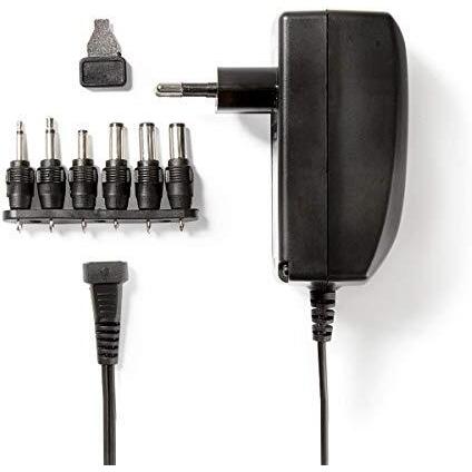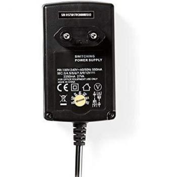 Alimentatore universale compatto da 27 W con ingresso 100‑240 V AC e uscita regolabile tra 3 e 12 V DC a 2,25 A, dotato di sei spine inter ...