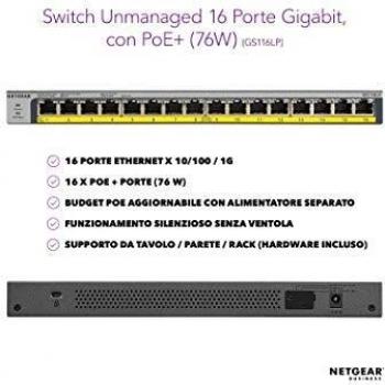 Netgear Switch Unmanaged Gigabit A 16 Porte 10/100/1000MBPS Tutte Poe+ - Budget POE Di Default 76W POE Flessibile Tramite Psu GS116LP-100EUS