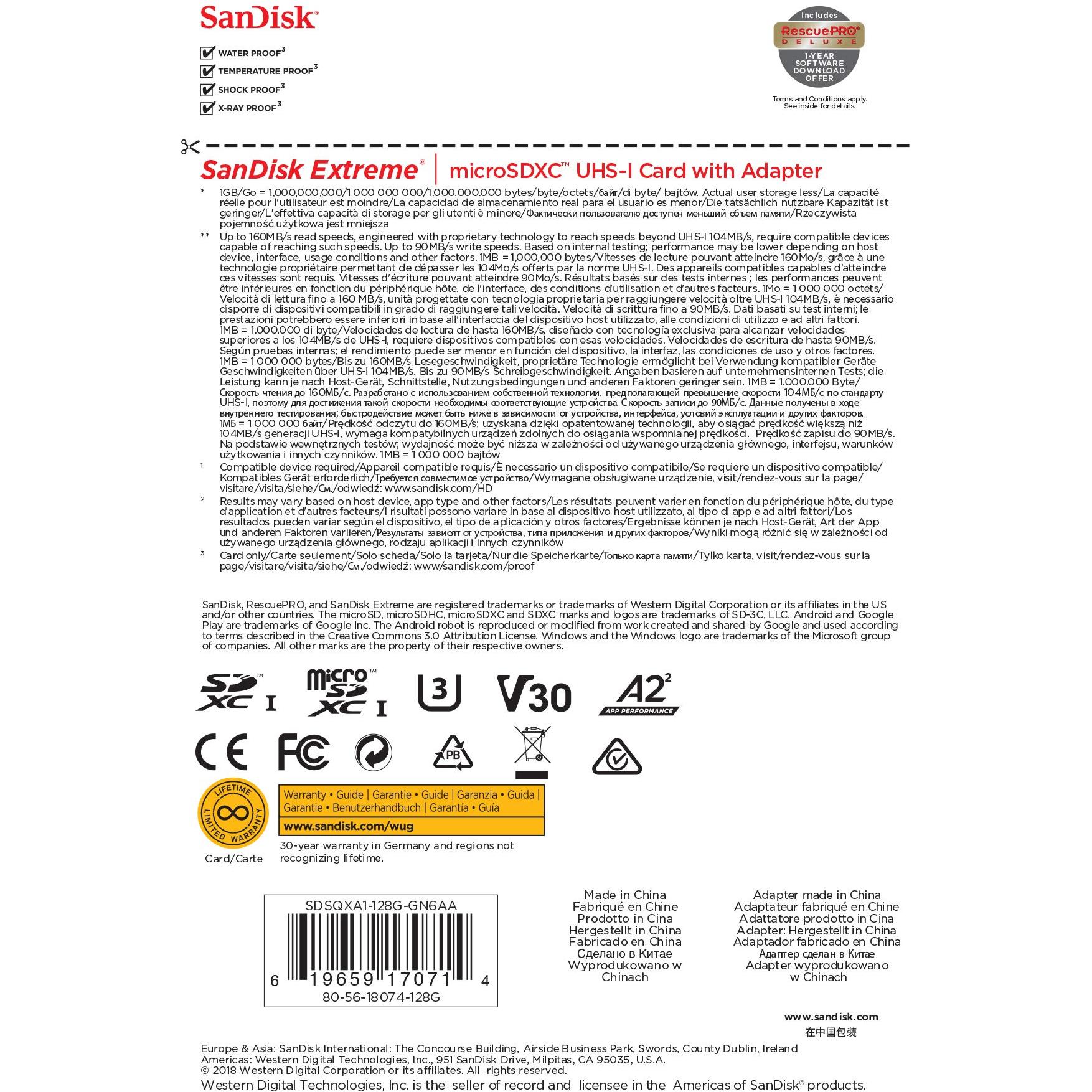 SanDisk Micro SD Extreme per Action Camera e Droni 128GB XC + adattatore SD (A2, V30, U3, UHS I, C10