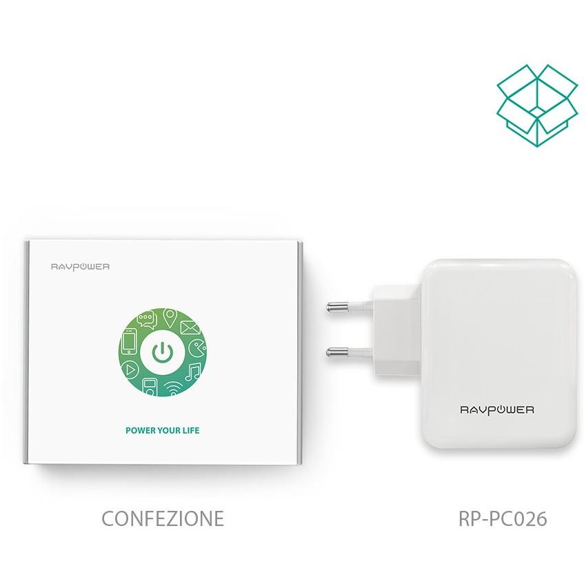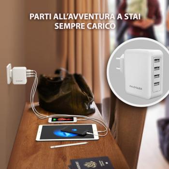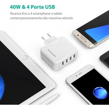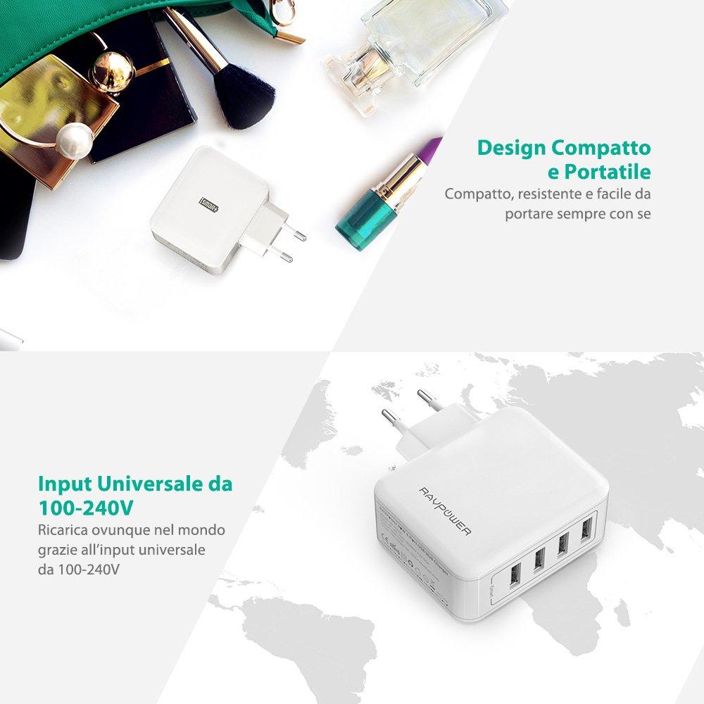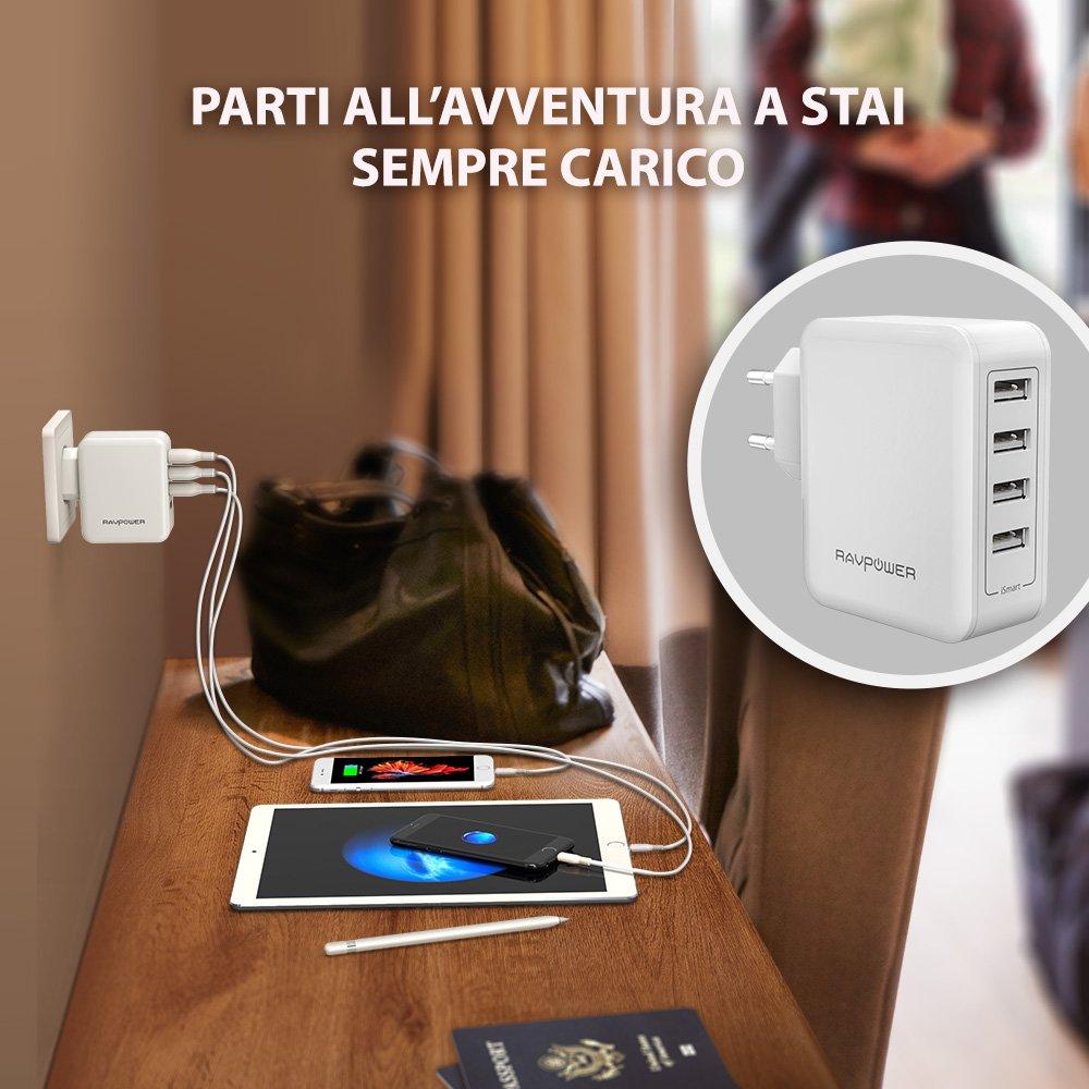 RAVPower Alimentatore USB Caricatore da Muro Portatile da 40W a 4 Porte USB iSmart 2.0, (5V/8A, 2.4A Max Per Porta), Compatibile con iPhone 7 7Plus 6 6s, iPad, Huawei, Galaxy, HTC, LG, ecc - Bianco