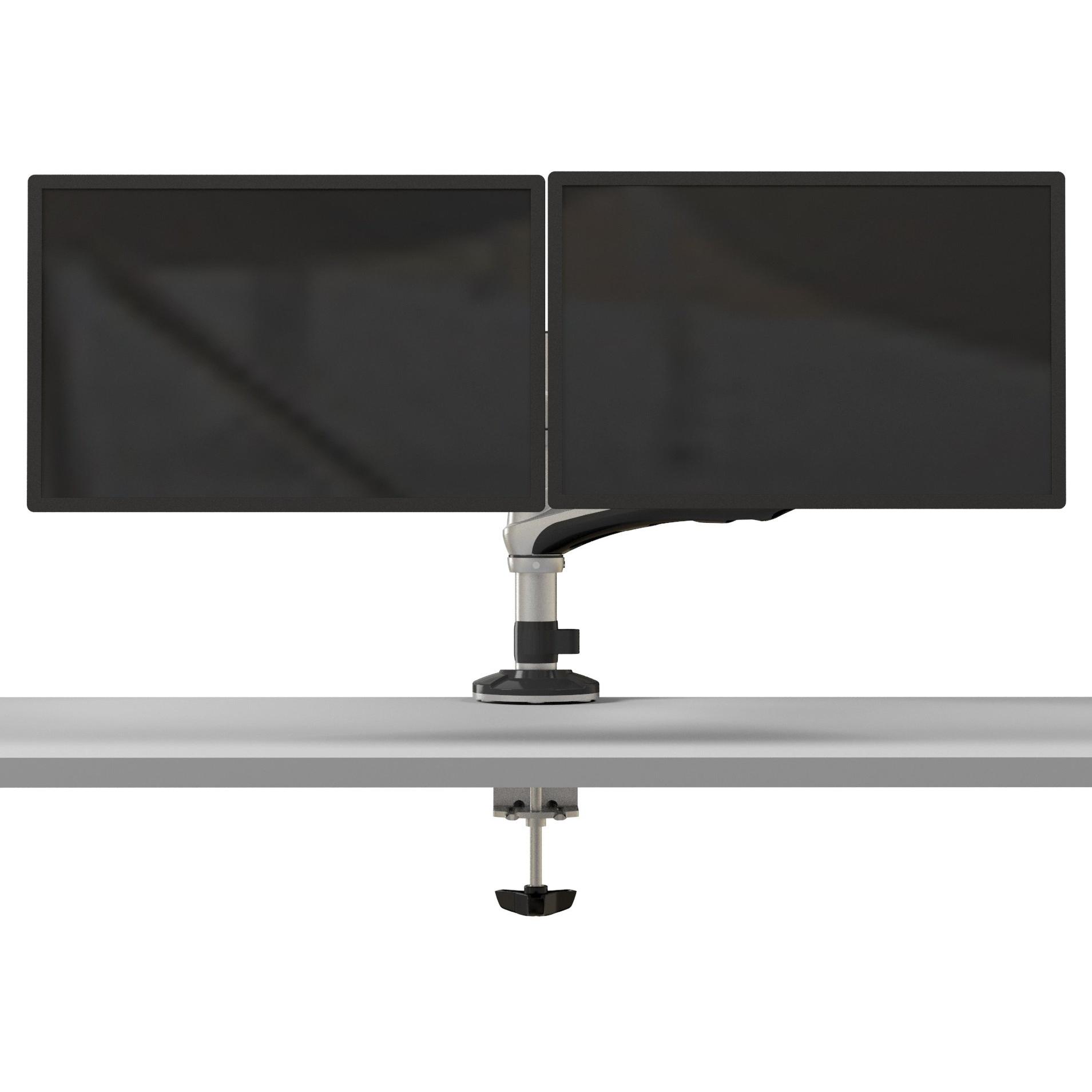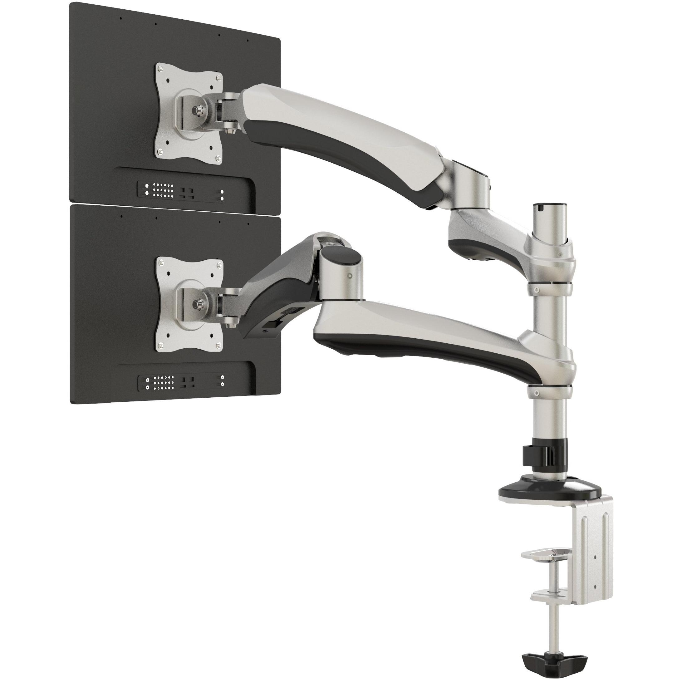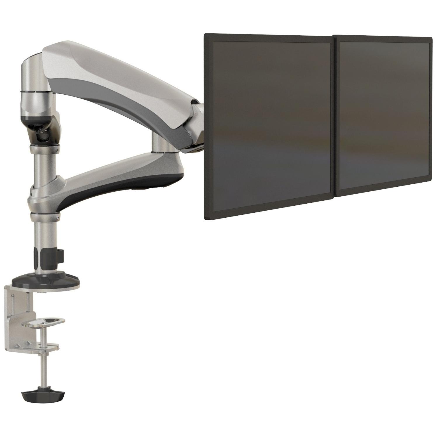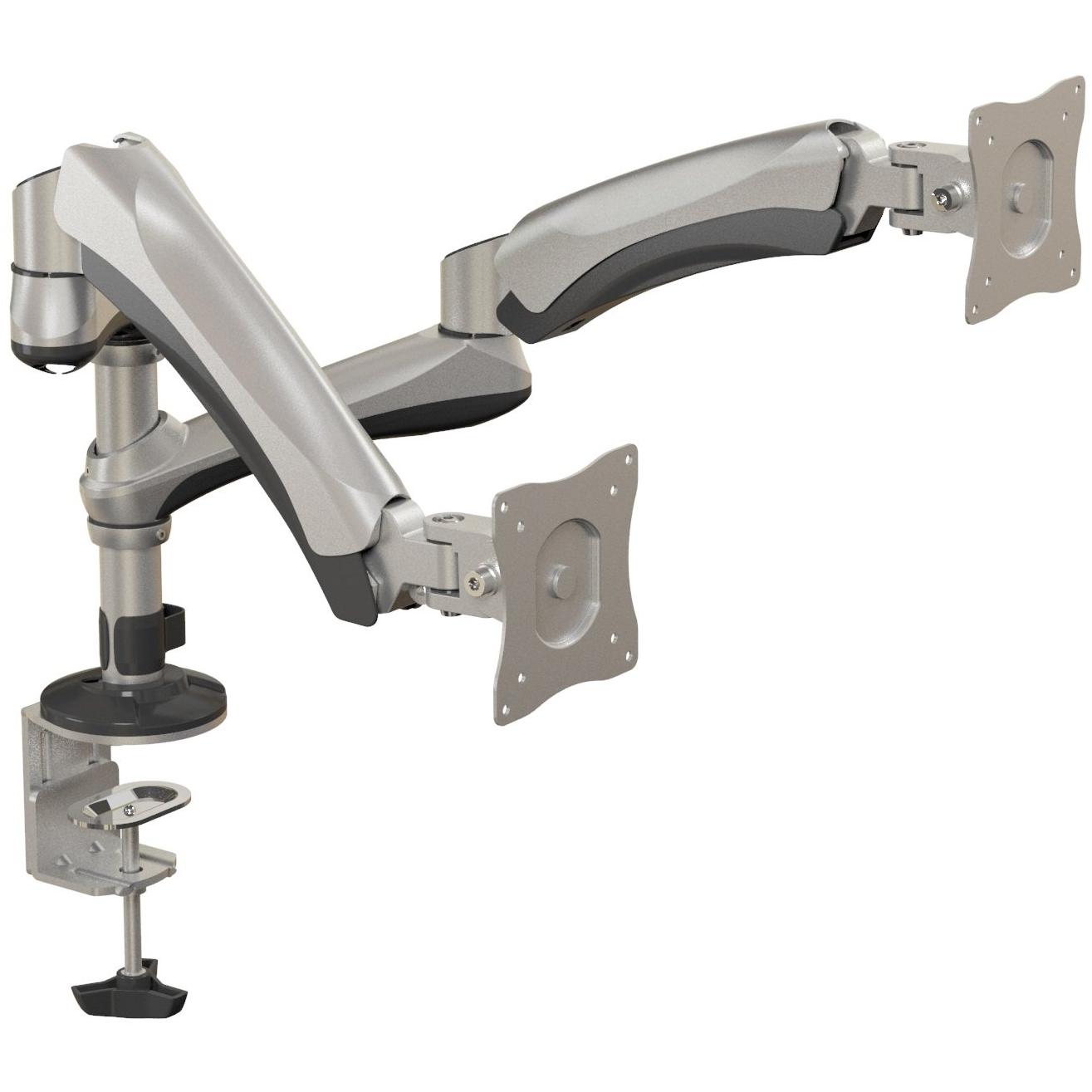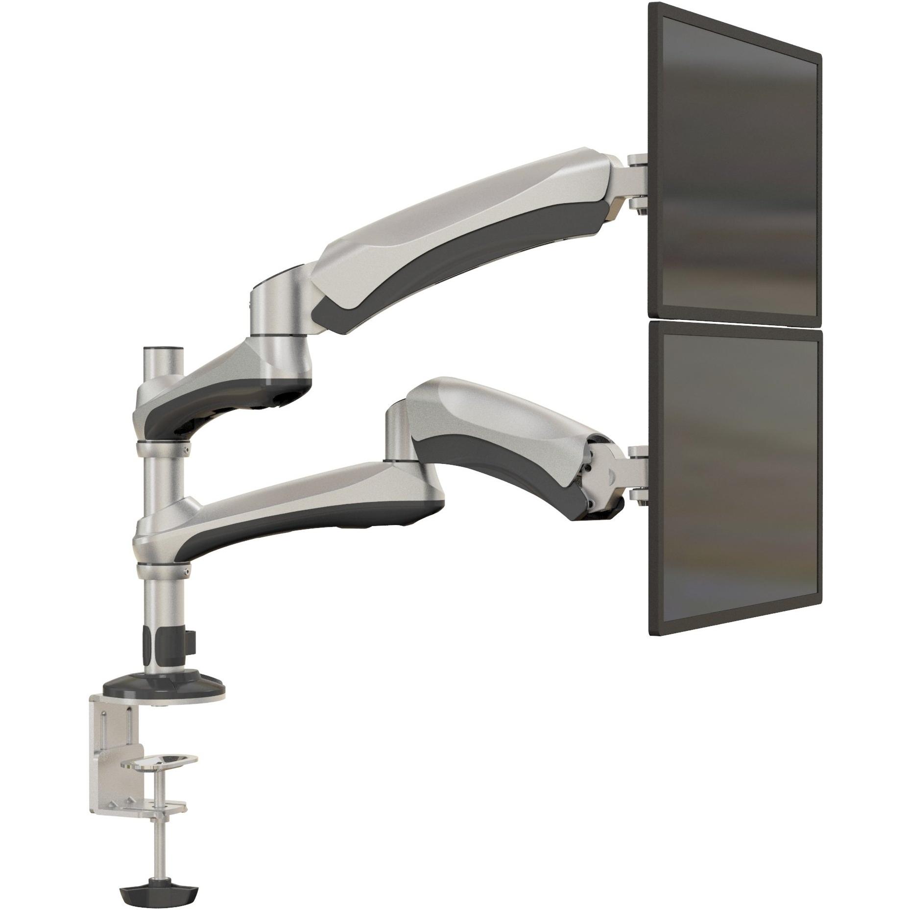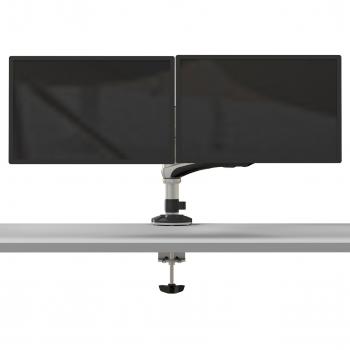 Supporto doppio in alluminio e acciaio con molla a gas che permette l’altezza regolabile fino a 590 mm, inclinazione da –90° a +90°, rotazione ...