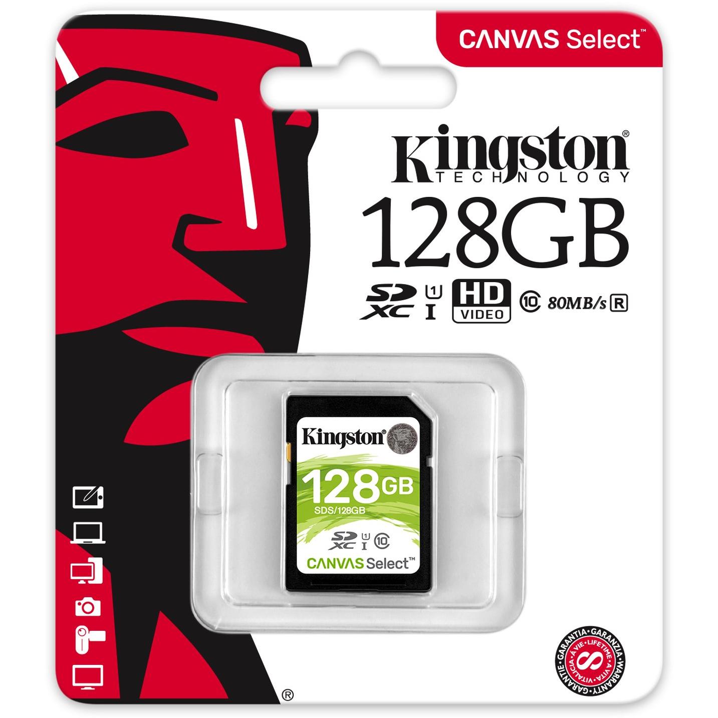 Kingston Scheda di Memoria SDXC Canvas Select 128 GB UHS-I di Classe 10 Velocità 80 MB / s