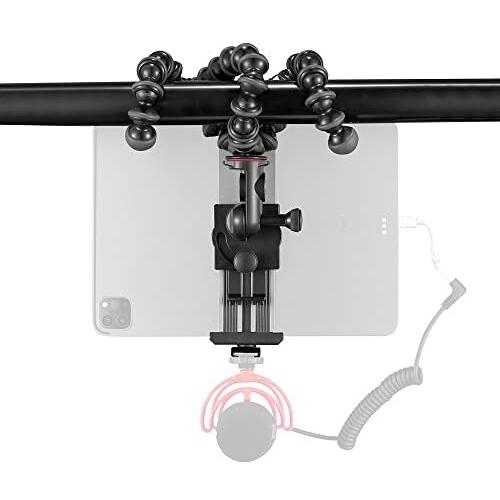 Supporto tablet con bracci articolati in metallo che si avvolgono attorno a qualsiasi superficie, offrendo stabilità su tavoli stretti; compatibile c ...