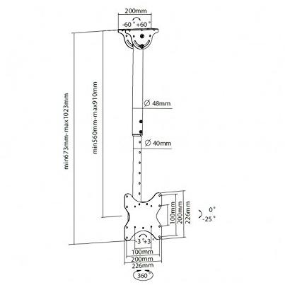 Supporto TV nero in acciaio con montaggio sul soffitto, altezza regolabile fino a 1023 mm e angolo di rotazione da 0° a 25°. Adatto per schermi da ...