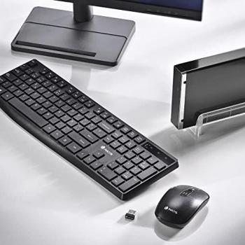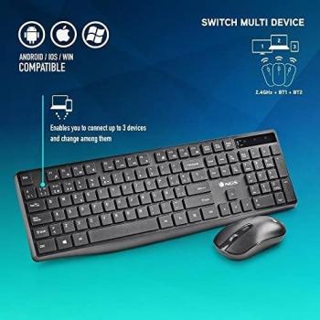Set completo di tastiera e mouse wireless in stile QWERTY spagnolo, con connessione Bluetooth 4.0 e 2,4 GHz per compatibilità multi‑dispositivo; ...