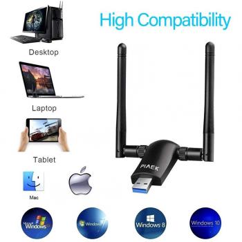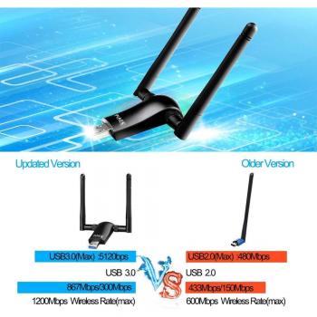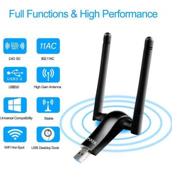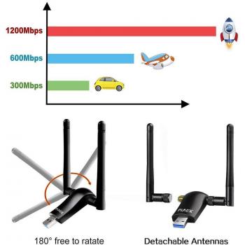 Chiavetta WiFi USB 3.0 con antenna a guadagno di 5 dBi che consente velocità fino a 1200 Mbps su dual‑band (867 Mbps a 5 GHz e 300 Mbps a ...