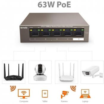 Tenda TEF1105P-4-63W è uno switch gestito con cinque porte Ethernet 10/100 Mbps, quattro delle quali forniscono PoE fino a 58 W complessivi. Il t ...