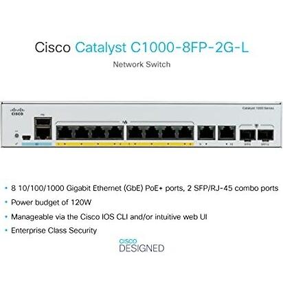 Cisco Catalyst 1000-8FP-2G-L Switch di rete a 8 porte PoE+ Gigabit Ethernet, budget PoE 120 W, 2 porte combinate SFP/RJ-45 da 1G, garanzia limitata a vita con formula avanzata (C1000-8FP-2G-L)