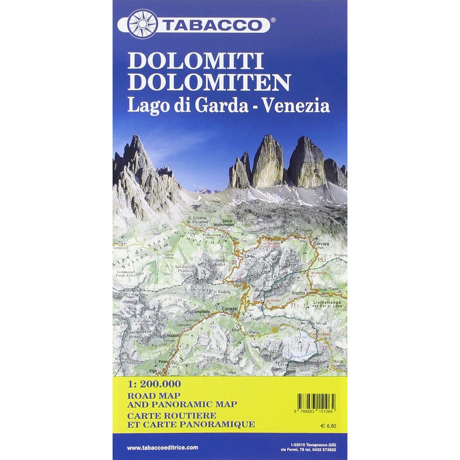 TABACCO - Dolomiti, Lago di Garda, Venezia. Carta stradale e Panoramica in scala 1:200.000. Ediz. multilingue